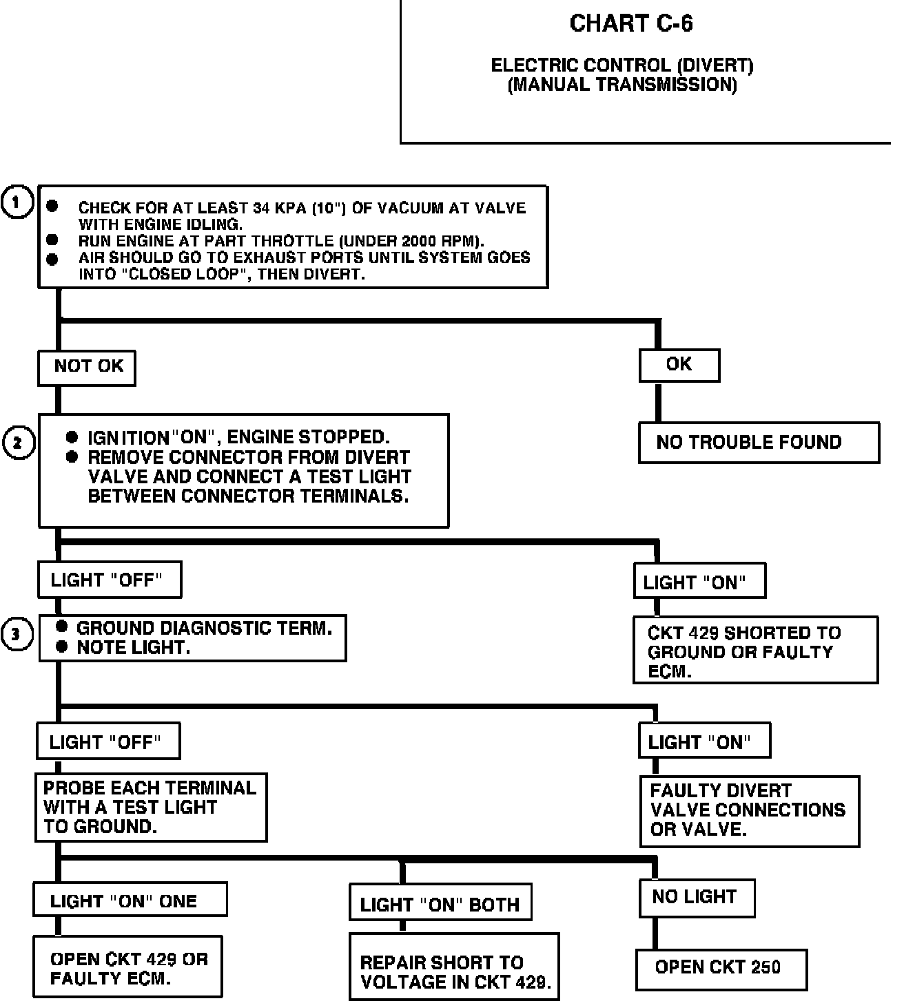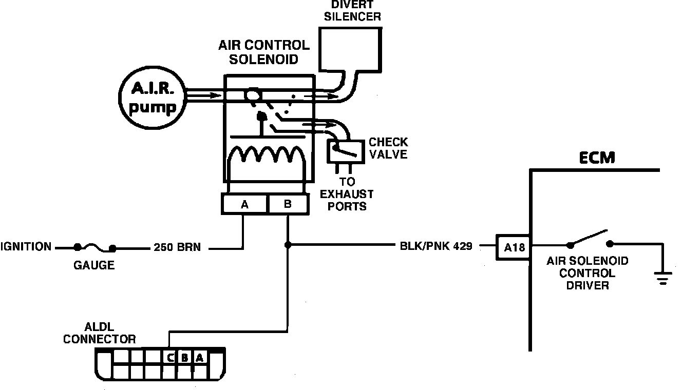 When the ECM grounds the circuit, the solenoid causes the valve to direct air to the exhaust ports. When de-energized, air diverts to the atmosphere, and air will be diverted to the ports provided that the valve has grounded at the ECM, and good manifold vacuum exists.