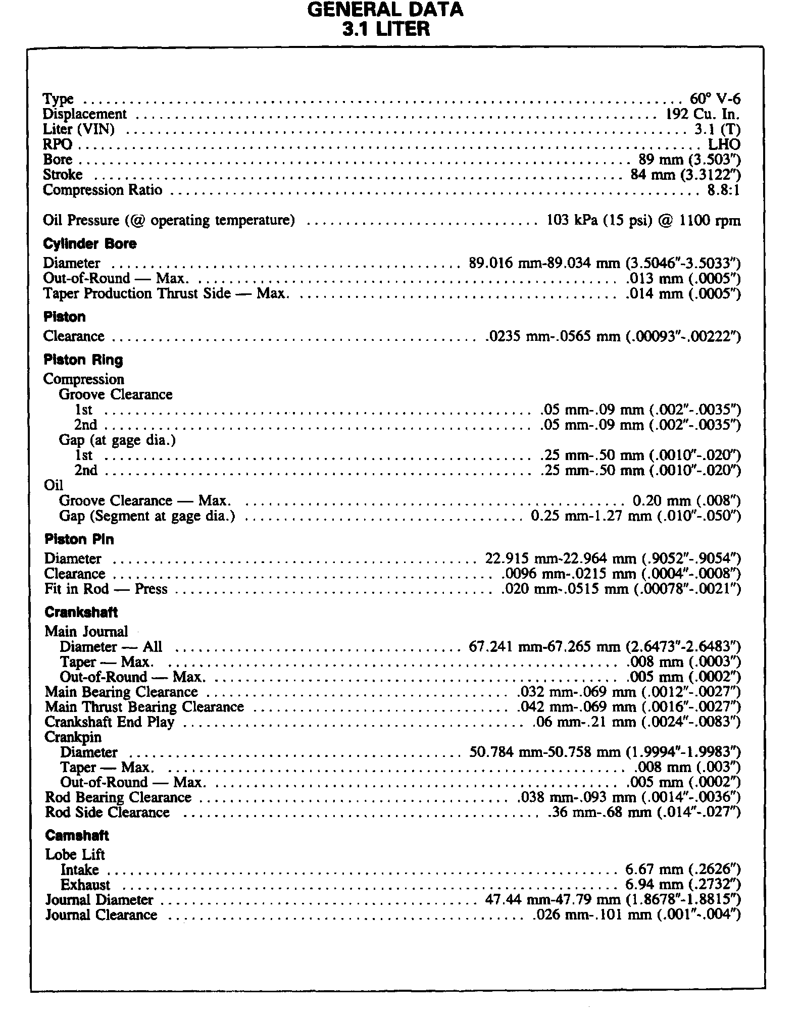 Engine Specifications (3.1L):