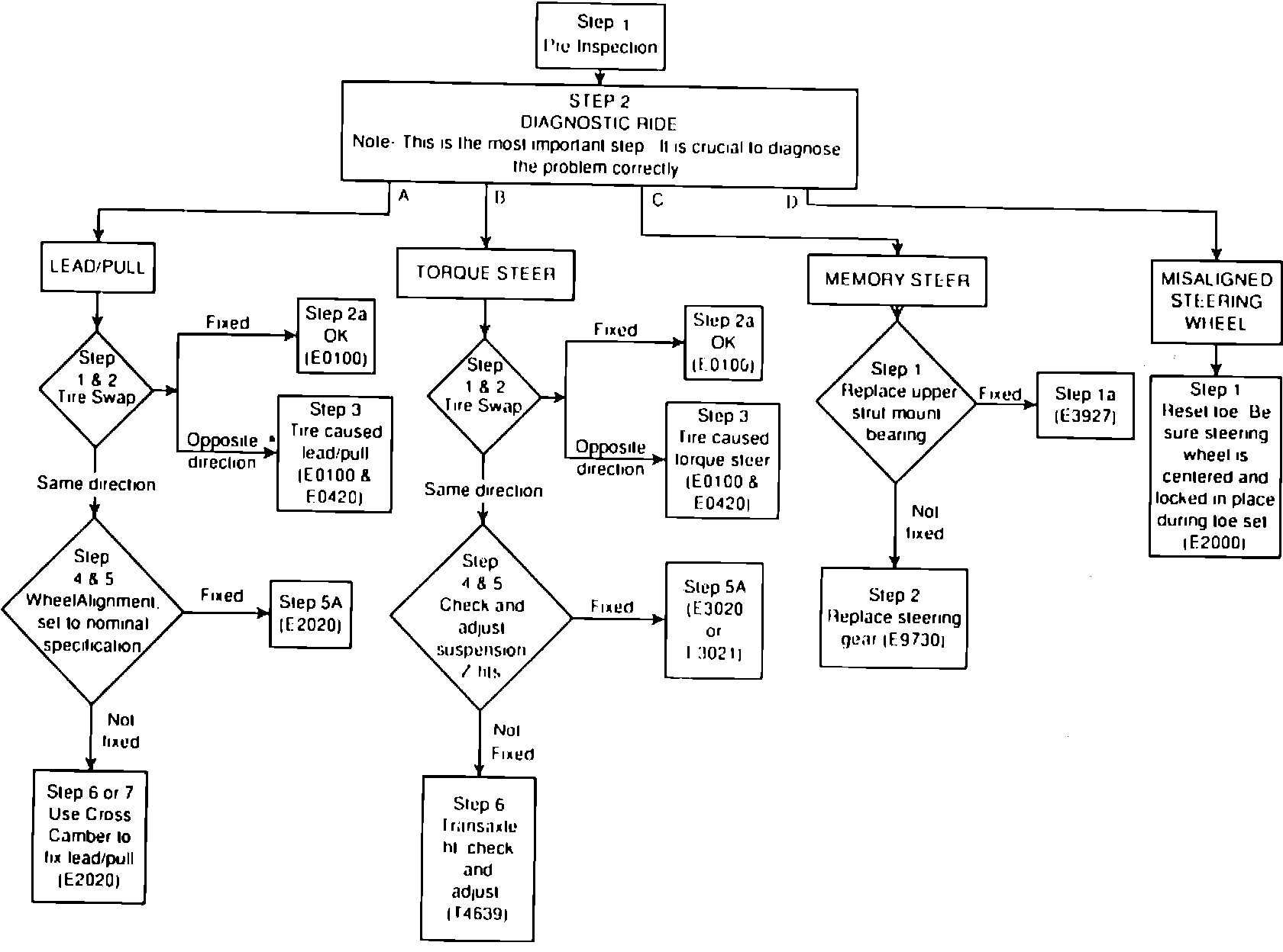 The following diagnostic and repair information has been developed and compiled to assist dealer service personnel in their efforts to diagnose and correct vehicles exhibiting lead/pull, torque steer, memory steer, steering wheel off-center, and/or unusual tire wear conditions. A flow chart which will be helpful in understanding the logic of the diagnostic and repair procedures is included (Figure 3).