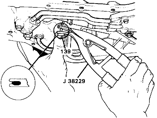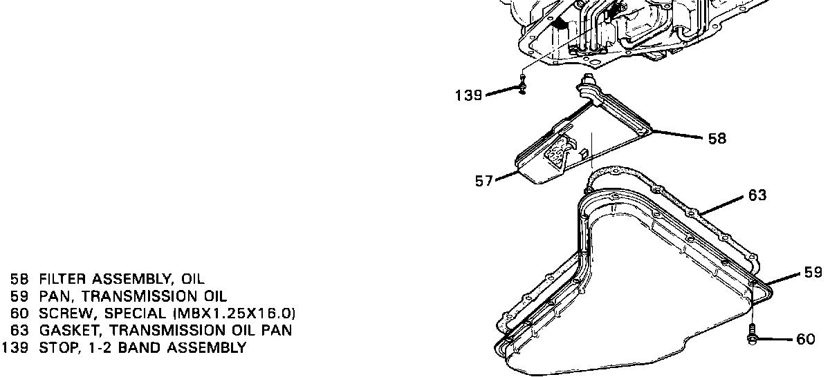 The 1-2 band stop (139) can be replaced while the transaxle is in the vehicle by removing the screws (60), transmission oil pan (59) and oil filter assembly (58) as listed in the Service Manual, then: