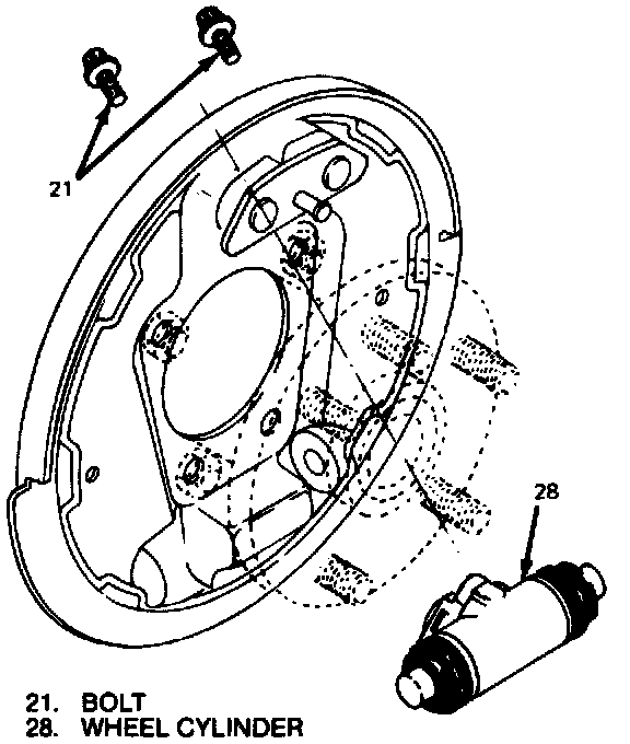 1. Position wheel cylinder assembly (28) and hold in place with wooden block between cylinder and axle flange.
