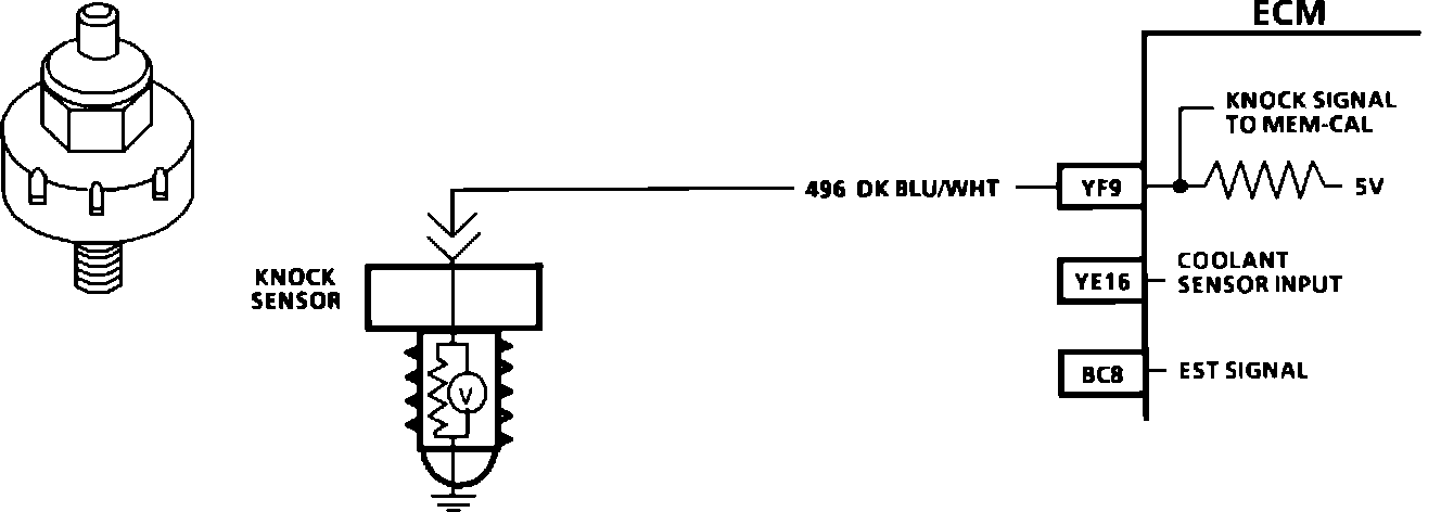 The knock sensor is used to detect engine detonation and the ECM will retard the electronic spark timing based on the signal being received. The circuitry, within the knock sensor, causes the ECM's 5.0 volts to be pulled down so that under a no knock condition, CKT 496 would measure about 2.5 volts. The knock sensor produces an AC signal, which rides on the 2.5 volts DC voltage. The amplitude and frequency are dependent upon the knock level.