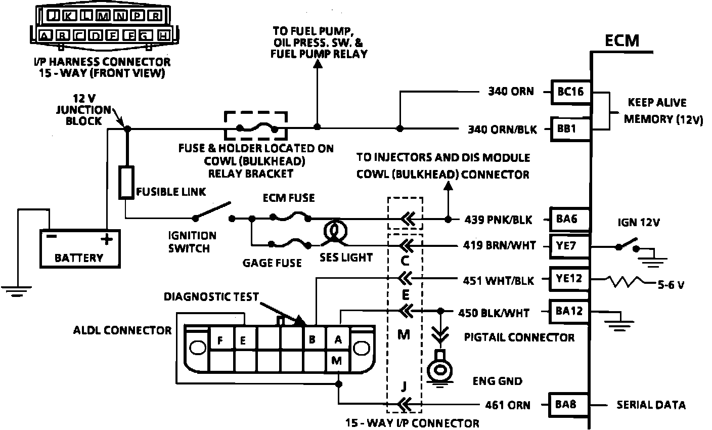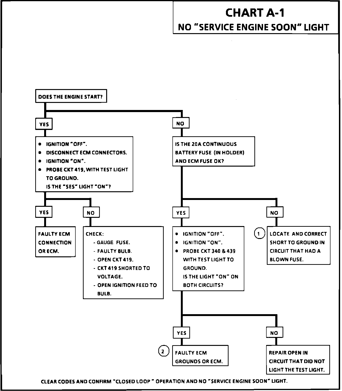 There should always be a steady "SERVICE ENGINE SOON" (SES) light when the ignition is "ON" and engine stopped. Battery is supplied directly to the light bulb. The Electronic Control Module (ECM) will control the light and turn it "ON" by providing a ground path through CKT 419 to the ECM.