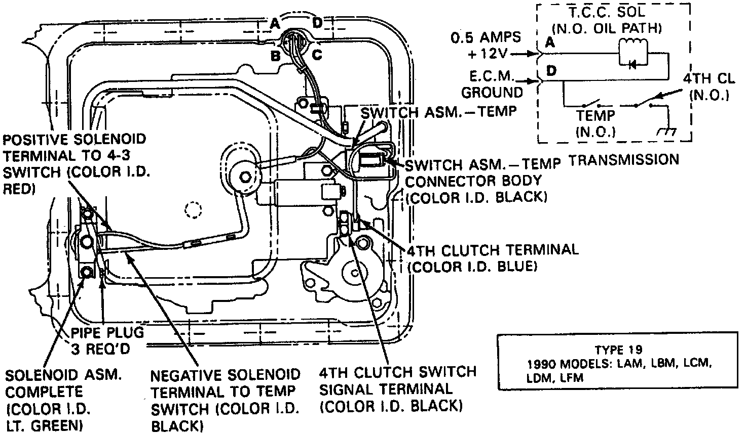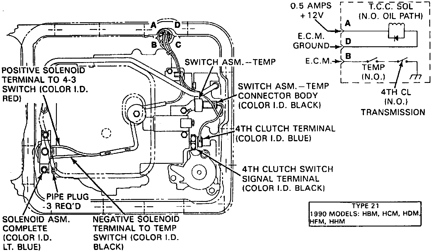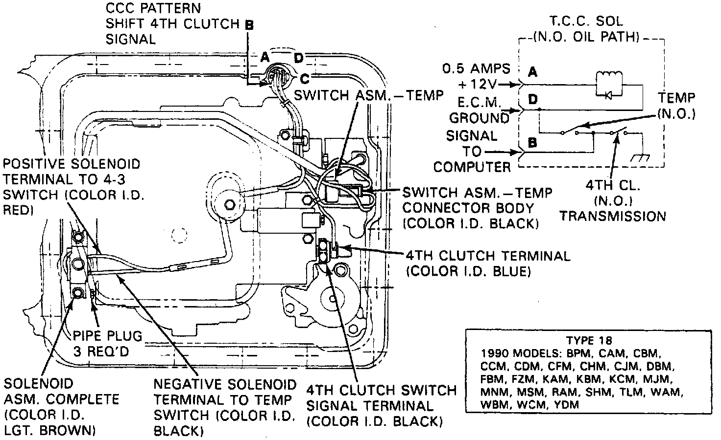 16. Select the proper transmission model code from the images - the model code designation is found within a box in the image. Correctly route and connect solenoid assembly wiring. The wire connectors are color coded to correspond to the information in the wiring diagram. On switches which take two connectors, the terminals are reversible.