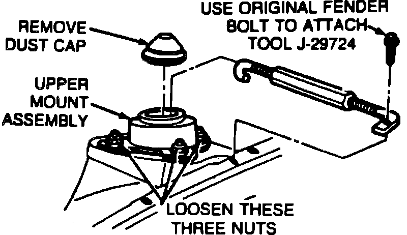 Caster adjustments are made by moving the position of the upper strut mount assembly, Fig. 1. To make adjustment, remove dust cap and fender bolt and attach tool J-29724 to original fender bolt, Fig. 2. Tighten the turnbuckle and loosen the three strut mount attaching nuts.
