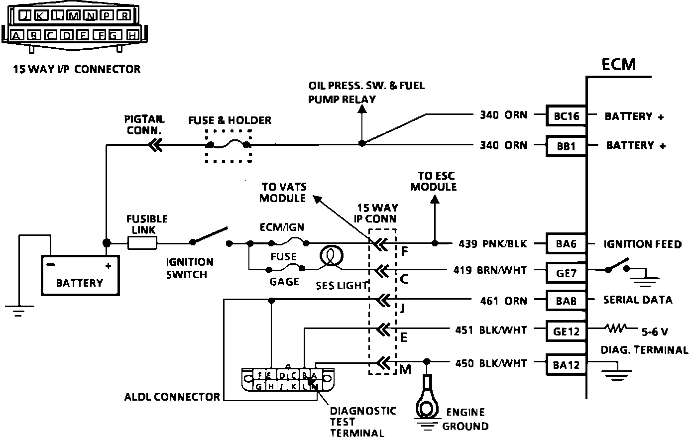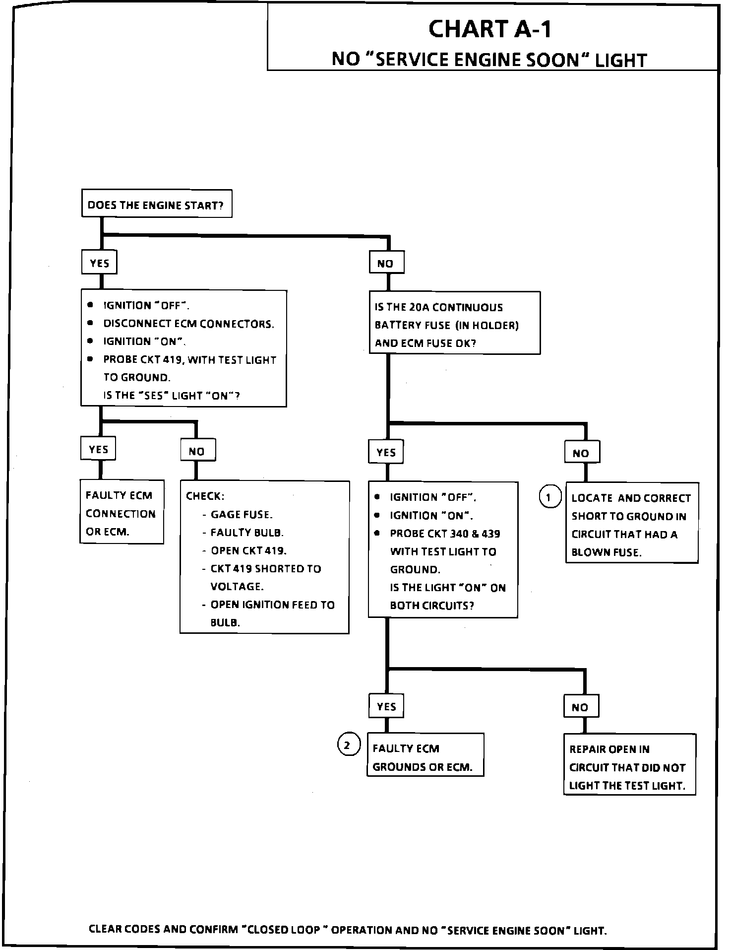 There should always be a steady "SERVICE ENGINE SOON" (SES) Light when the ignition "ON" and engine stopped. Battery is supplied directly to the light bulb. The Electronic Control Module (ECM) will control the light and turn it "ON" by providing a ground path through CKT 419 to the ECM.