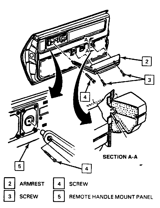 2. Armrest (2) from the door trim panel and the trim pad switch and remote handle mount panel (5).