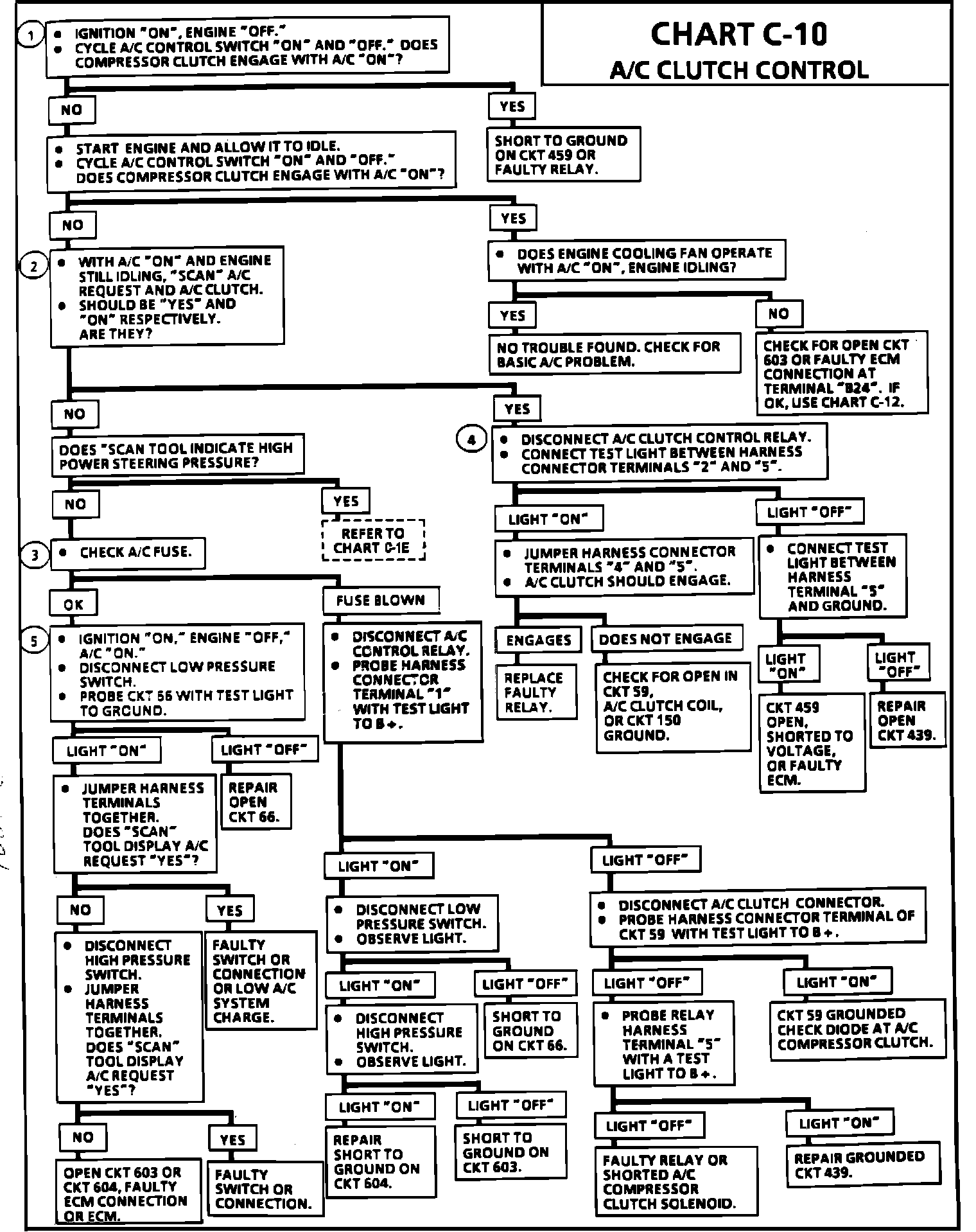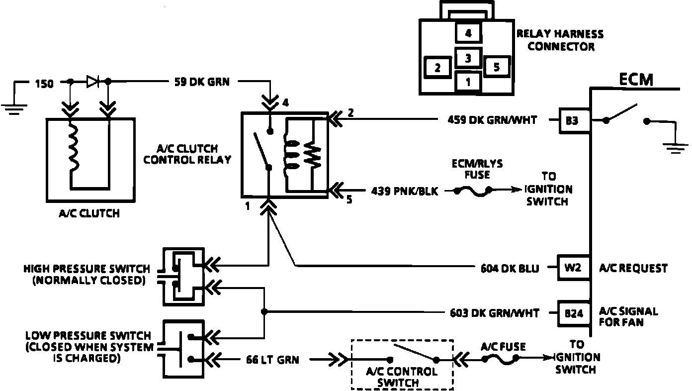 When an A/C mode is selected on the A/C control switch, ignition voltage is supplied to the compressor low pressure switch. If there is sufficient system pressure, the low pressure switch will be closed and will complete the circuit to the high pressure cut-off switch and to circuit 604. The voltage on circuit 604 to the ECM is shown on the "Scan" tool as A/C request "YES" (voltage present) or "NO" (no voltage). When a request for A/C is sensed by the ECM, the ECM will ground circuit 459 of the A/C clutch control relay. The relay will then send current to circuits 604 and 59 to engage the A/C compressor clutch. A "Scan" tool will display circuit 459 grounding by showing A/C clutch "ON." If the ECM sensed voltage from circuit 603, the cooling fan will be energized.