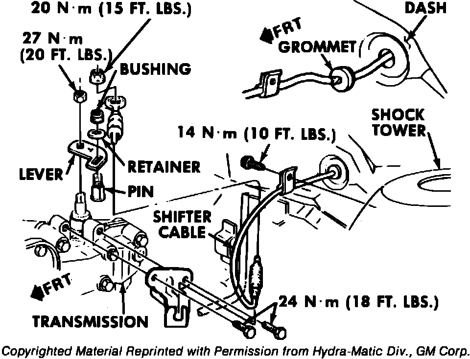 3. Loosely assemble retainer, bushing and shift cable to pin, Figs. 3 through 7, then torque attaching nut to specifications.