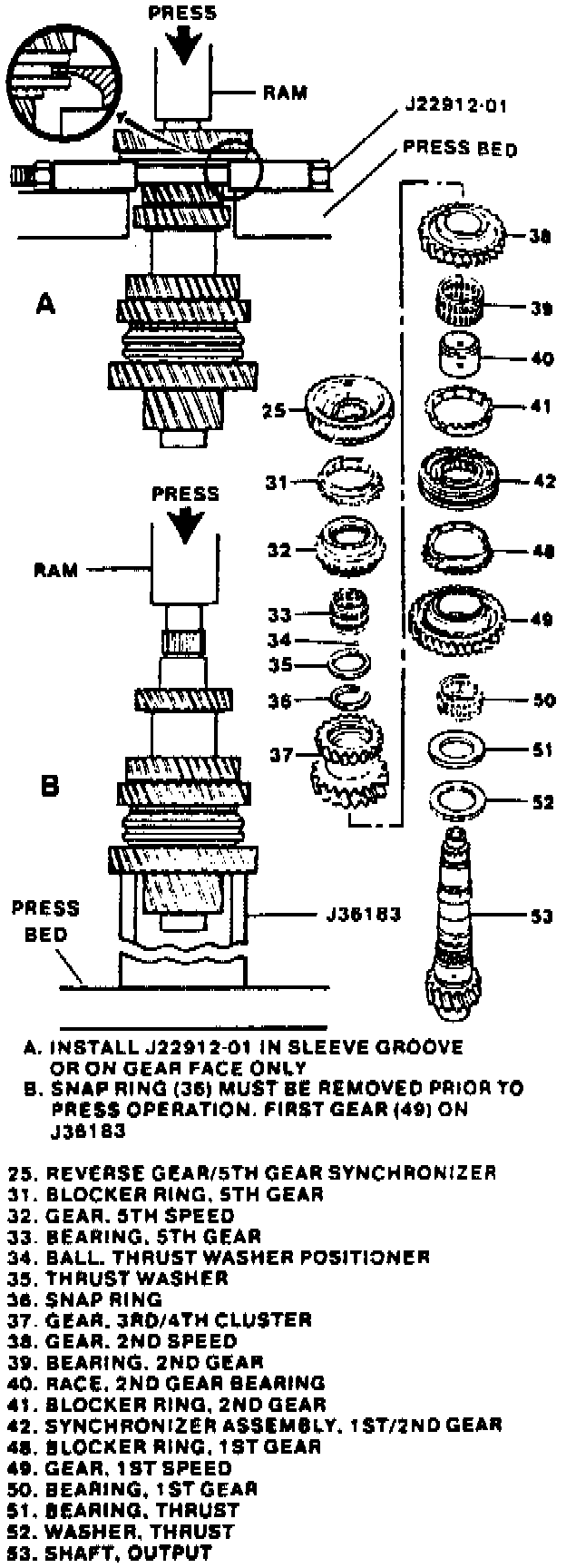 A hydraulic press (15 ton force minimum), tools J-22912-01 and J-36183 are required to conduct the following procedure. Also, identify blocker ring (31) for the 5th gear, blocker ring (41) for 2nd gear and blocker ring (48) for 1st gear. Do not interchange these blocker rings.