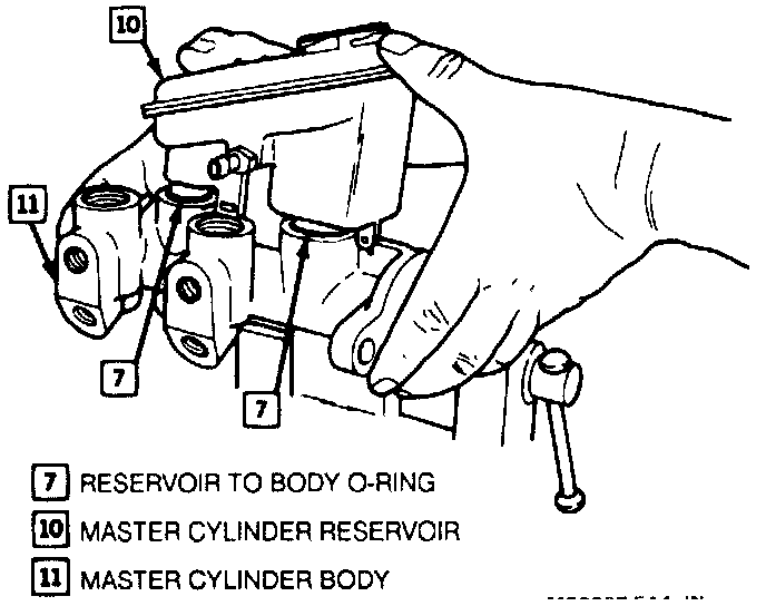 4. Remove reservoir to body "0" rings (7) from grooves in master cylinder reservoir (10) and dispose of "0" rings (7).
