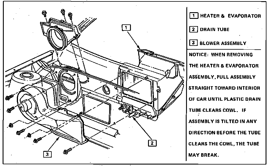 10. Remove heater core cover attaching screws, then gently pull cover rearward and out of vehicle, Fig. 12. When removing heater core assembly, pull assembly straight toward interior of vehicle until plastic drain tube clears cowl. If assembly is tilted in any direction before tube clears cowl, the drain tube may break.