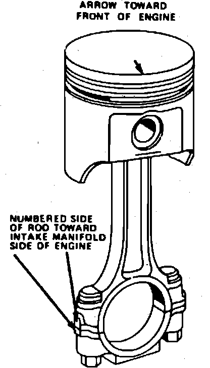 Assemble piston to rod, with notch on piston head toward front of engine and numbered side of rod toward intake manifold side of engine, Fig. 12. Upon installation, measure rod bearing side clearance using a feeler gauge. Rod bearing side clearance should be .0039-.0149 inch.