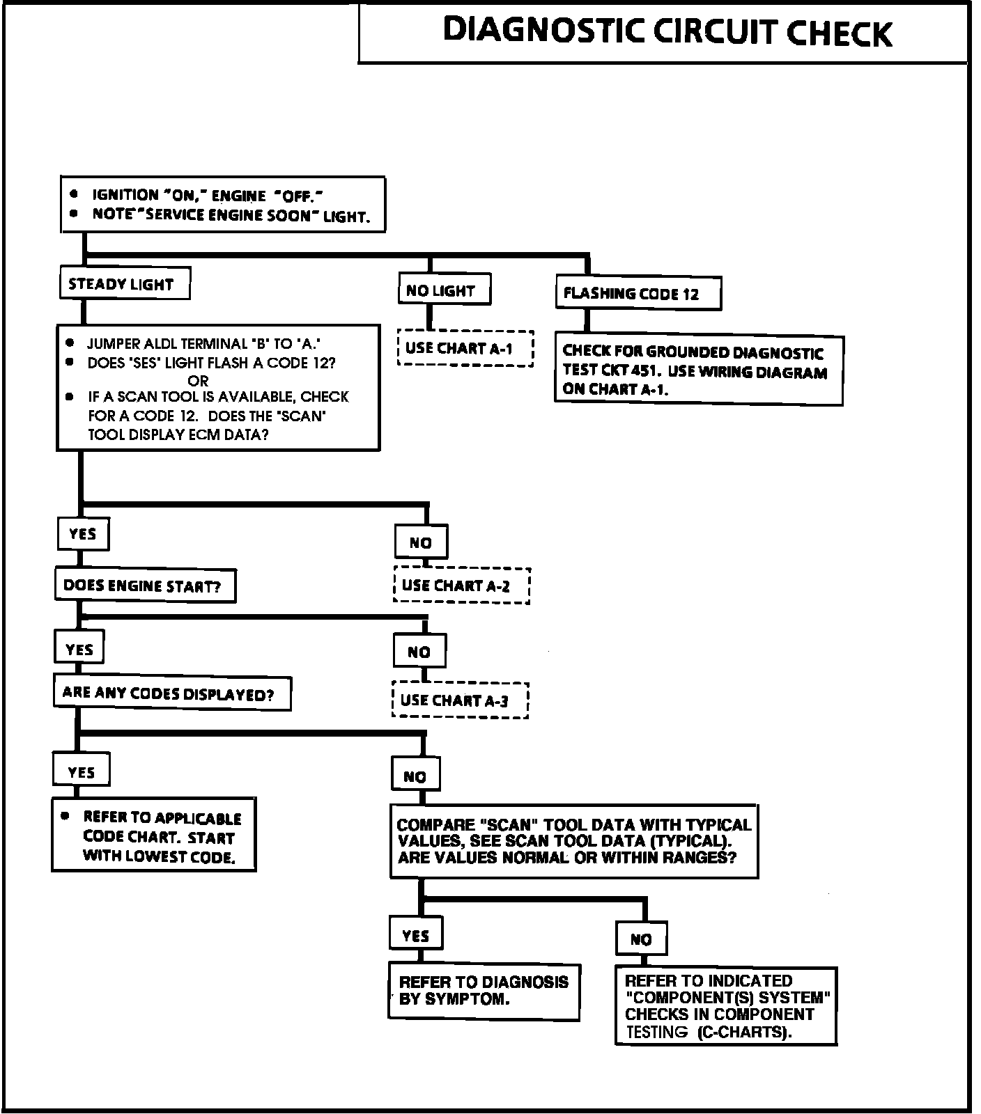 1. Bulb Check - to check "SES" light circuit and that the computer can complete the circuit. The system check starts with a bulb check. If there is no "SERVICE ENGINE SOON" light, refer to CHART A-1.