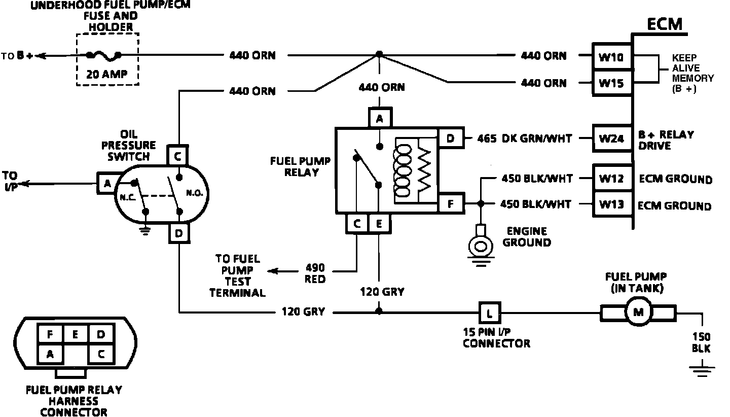 The oil pressure switch is mounted on the engine. This switch operates as a parallel power supply with the fuel pump relay to supply battery voltage to the fuel pump. Voltage is supplied to the fuel pump after approximately 28 kPa (4 PSI) oil pressure is reached.