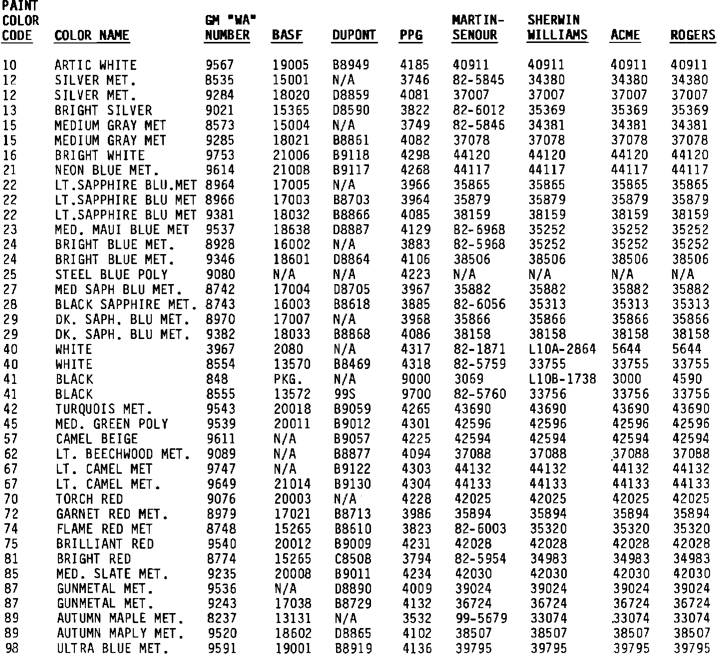 Attached for your information is the 1991 paint code information for Pontiac colors.