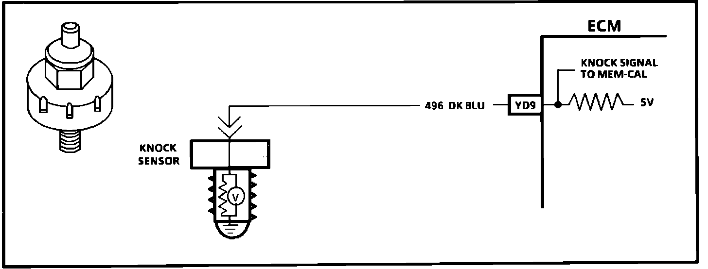 The knock sensor is used to detect engine detonation and the ECM will retard the electronic spark timing based on the signal being received, The circuitry within the knock sensor causes the ECM's supplied 5.0 volt signal to be pulled down so that under a no knock condition, CKT 496 would measure about 2.5 volts.