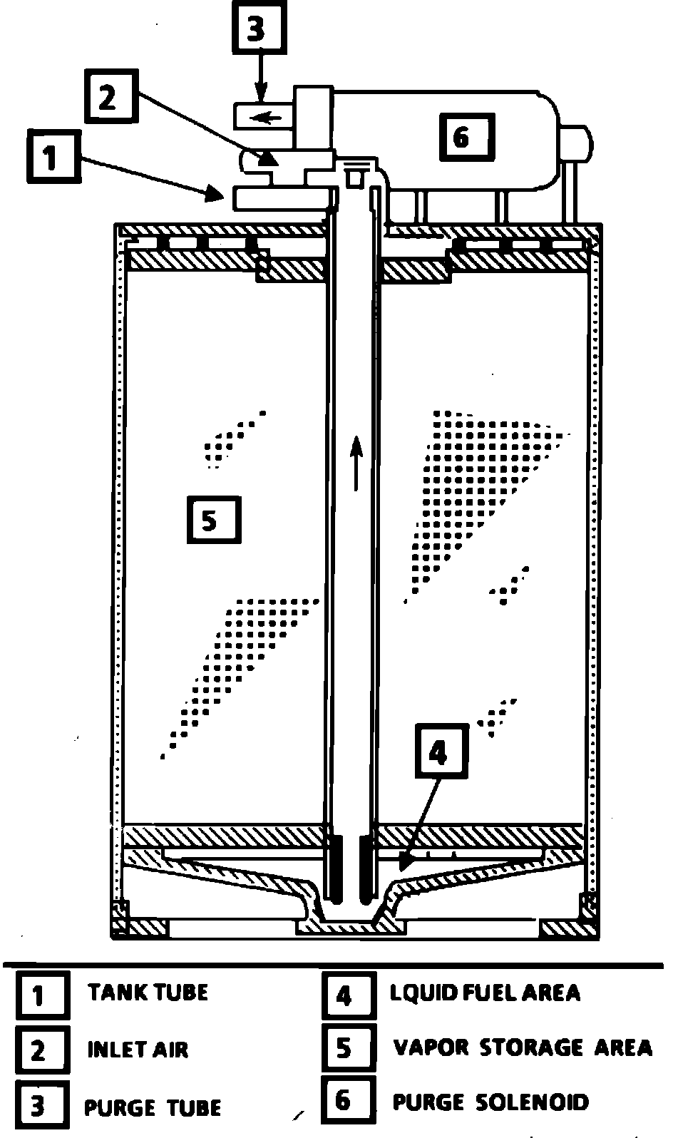 Gasoline vapors from the fuel tank flow into the tube labeled "TANK". Any liquid fuel goes into a reservoir at the bottom of the canister to protect the carbon bed above. These vapors are absorbed into the carbon. The canister is purged when the engine is running above idle speed. Ambient air is allowed into the vapor canister through the top air tube. The air mixes with the vapor and is drawn into the intake manifold to be burned.