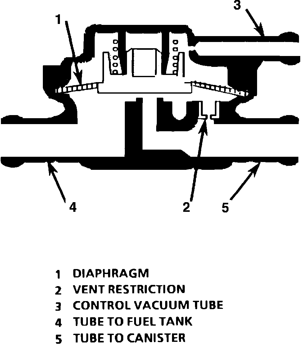 The fuel tank pressure control valve is a combination roll-over, integral pressure, and vacuum relief valve. When vapor pressure in the tank exceeds 1" Hg (5 kPa) the valve opens and allows vapors to vent to the canister, and then purged. When the tank pressure drops below the opening point of the valve, it will close. This allows fuel vapors to be trapped in the fuel tank. The valve provides vacuum relief to protect against vacuum build up in the fuel tank, and roll-over protection to prevent liquid fuel from entering the canister during normal driving maneuvers.