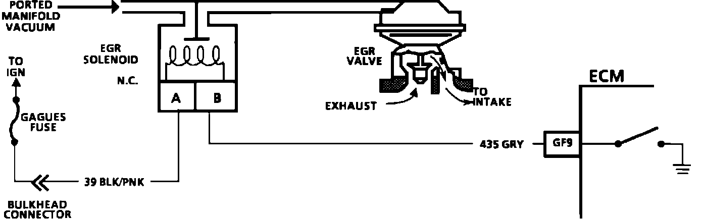 The EGR valve is controlled by a normally open, Pulse Width Modulated (PWM) solenoid. The ECM turns the solenoid "OFF", to allow vacuum to flow to the EGR. The ECM turns the solenoid "ON" to prohibit EGR operation.