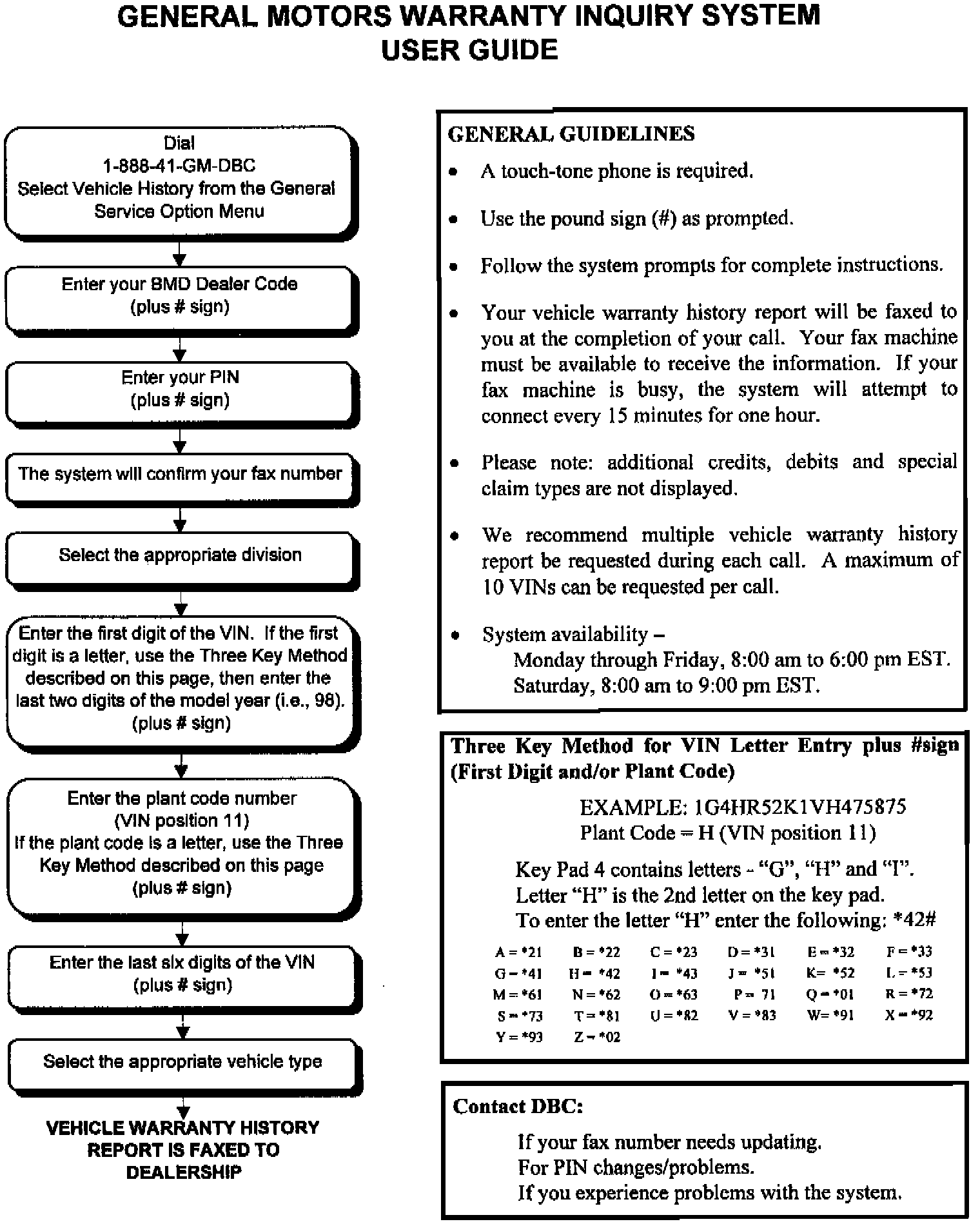 General Motors is pleased to announce that an enhanced GM Warranty Inquiry System is now being made available to all GM Dealers in the U.S. (excluding Saturn), effective Monday, May 4, 1998. This system, accessed by contacting the DBC at 1-888-41-GM-DBC using any touch-tone telephone in your dealership, provides a vehicle history print via return fax. This vehicle history, which consists of warranty repairs and other key service-related information, may be particularly useful when repairing units that have not been consistently serviced at your dealership.