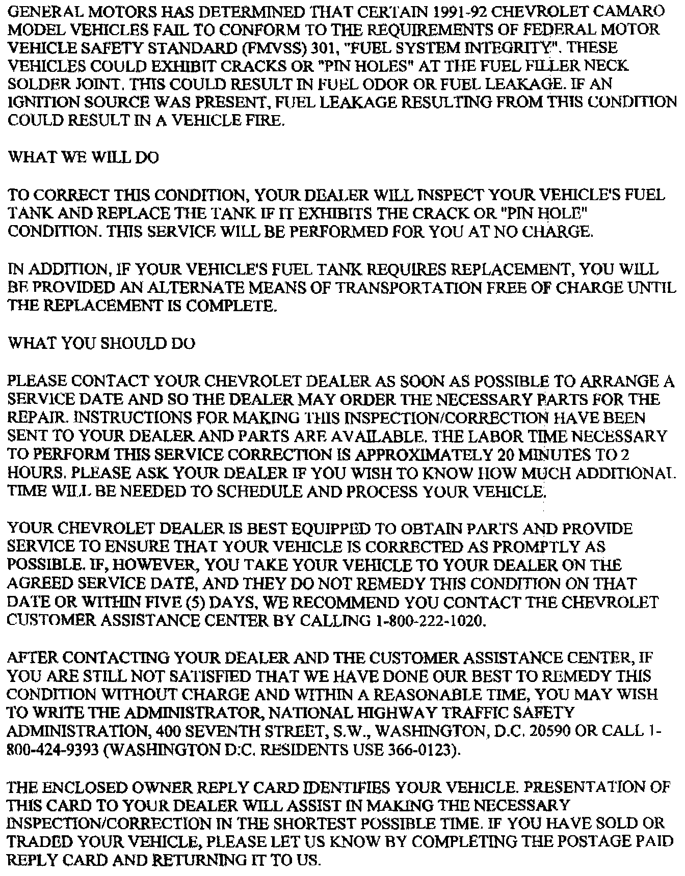 Recall - Fuel Tank Inspection/Replacement