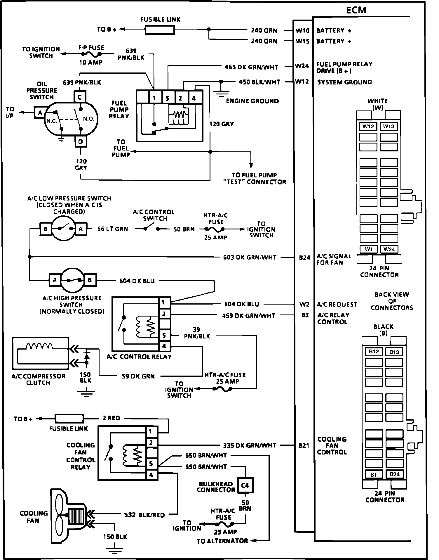The oil pressure switch is mounted on the engine. This switch operates as a parallel power supply with the fuel pump relay to supply battery voltage to the fuel pump. Voltage is supplied to the fuel pump after approximately 28 kPa (4 PSI) oil pressure is reached.