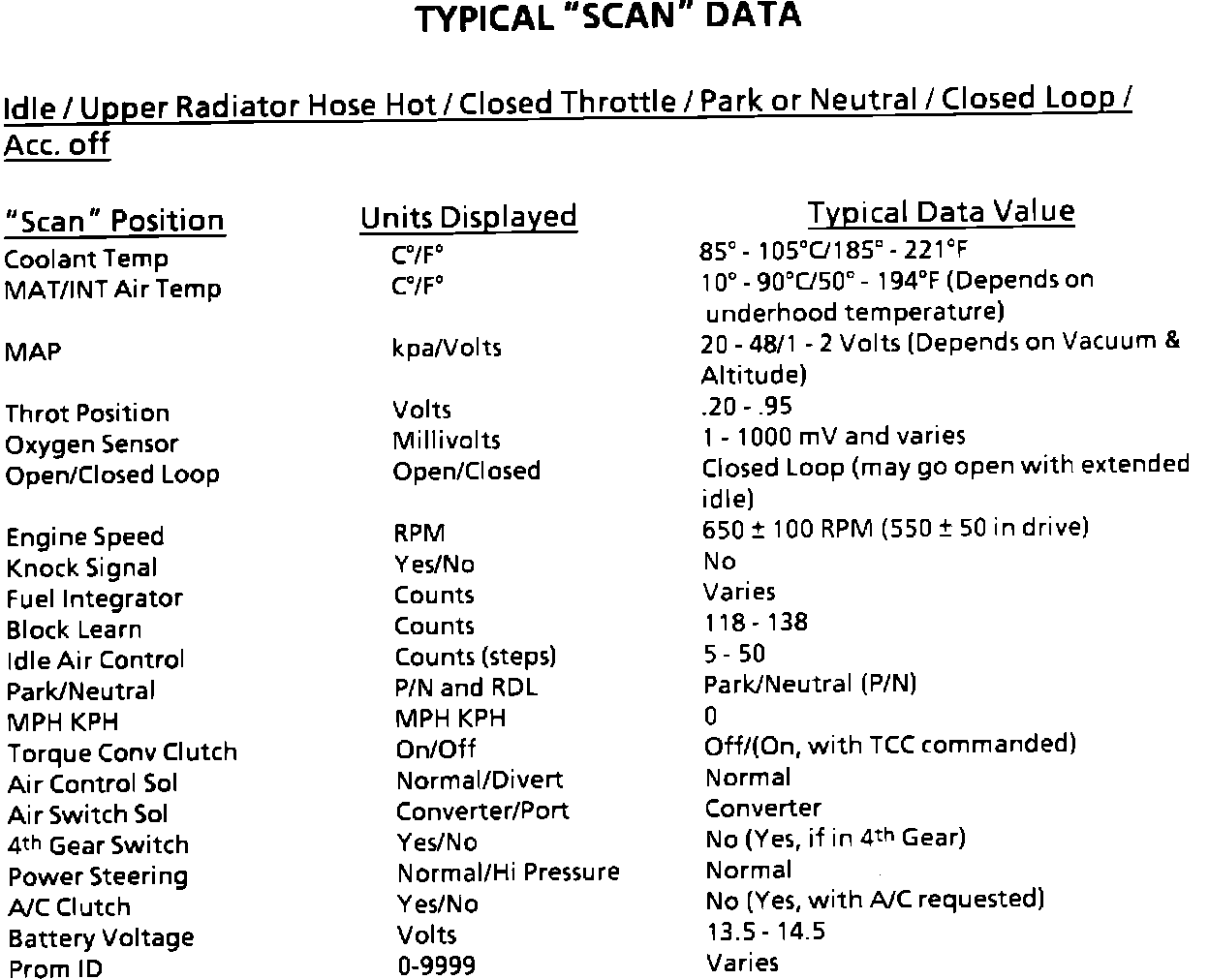 7. Comparison of actual control system data with the typical values is a quick check to determine if any parameter is not within limits. Keep in mind that a base engine problem (i.e. advanced cam timing) may substantially alter sensor values.