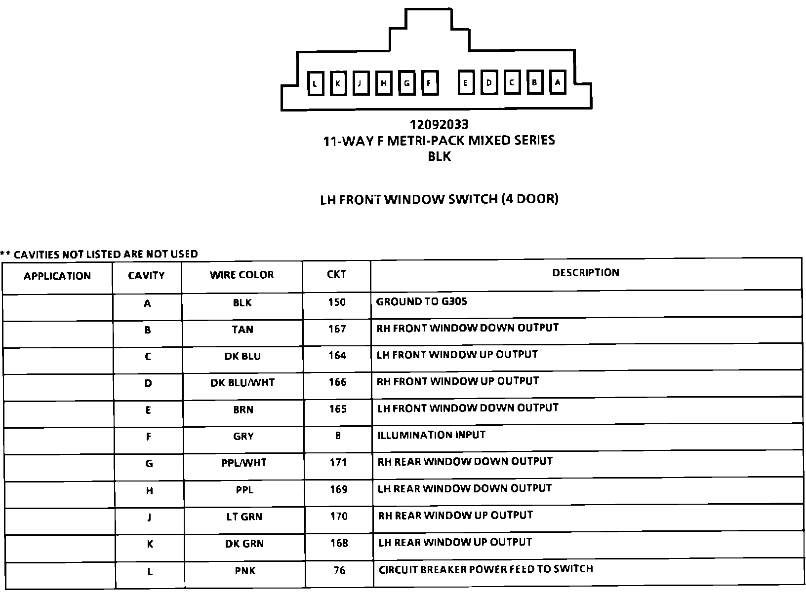 Keyless Entry Module, Front Door Lock Switch (4 Door), Pneumatic Seat Control Module, Rear Window Switch, RH Front Window Switch (4 Door) Connector Faces: