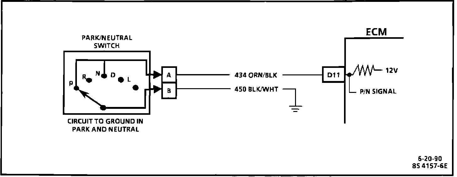 The Park/Neutral (P/N) switch gets a 12 volt reference from the PCM, and the PCM monitors the circuit. When the switch is in the park or neutral position, it grounds the circuit, causing a drop in the circuit voltage. Low voltage in circuit 434 indicates the transmission is not in a drive gear. The PCM uses this information for the following:
