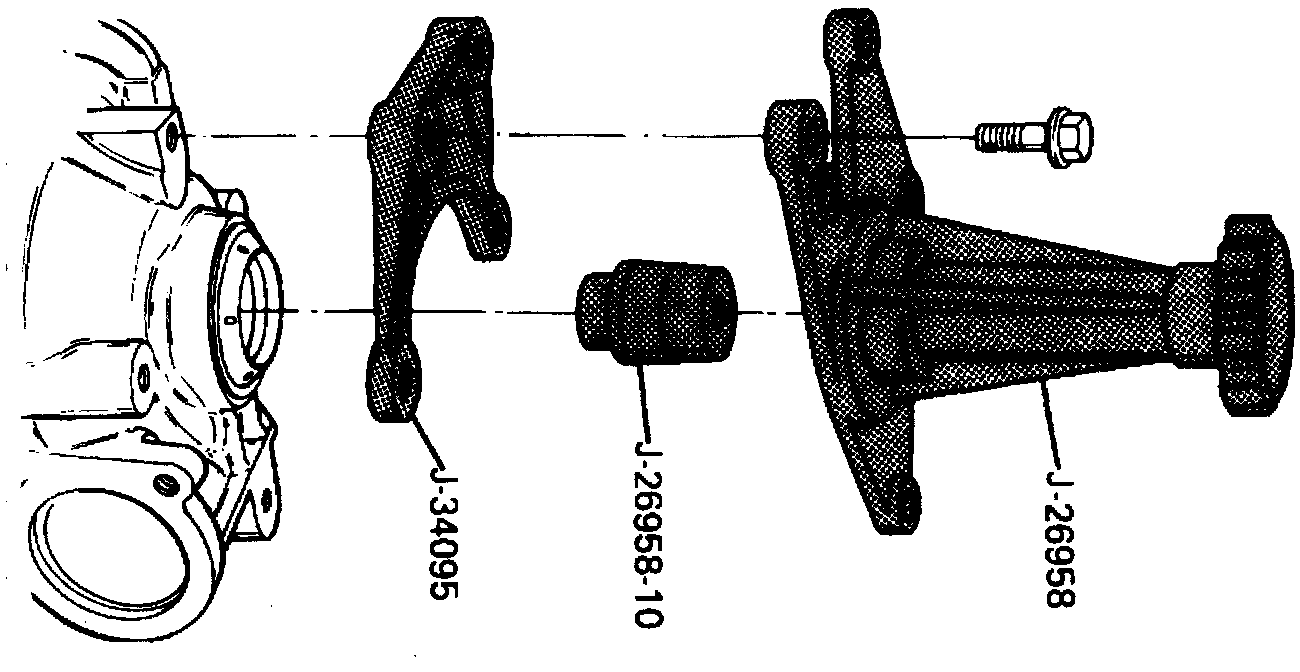 30. Remove indicator, support and adapter, then install output shaft aligning and loading tools J-26958 and J-26958-10 along with adapter J-34095 or equivalents.