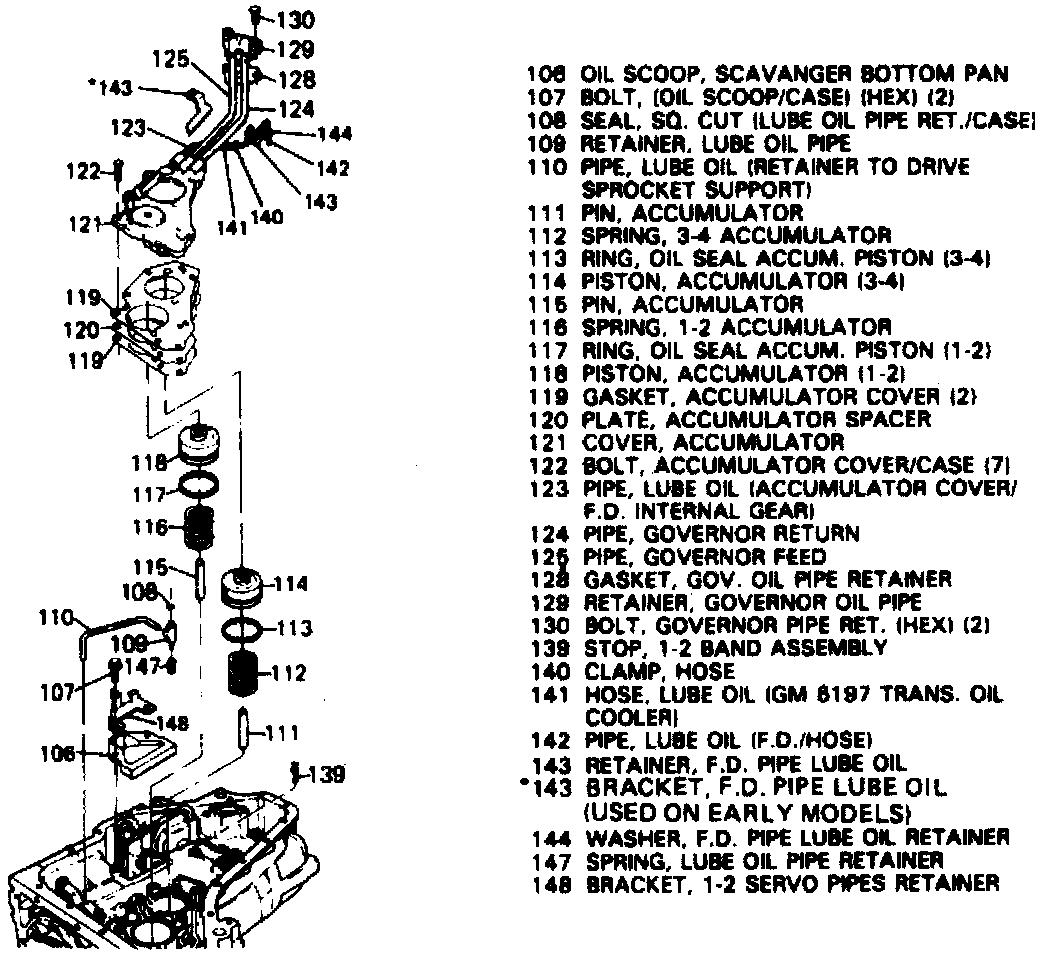 185. Remove oil pipes from accumulator cover and governor retainer then the governor screen from pipe.