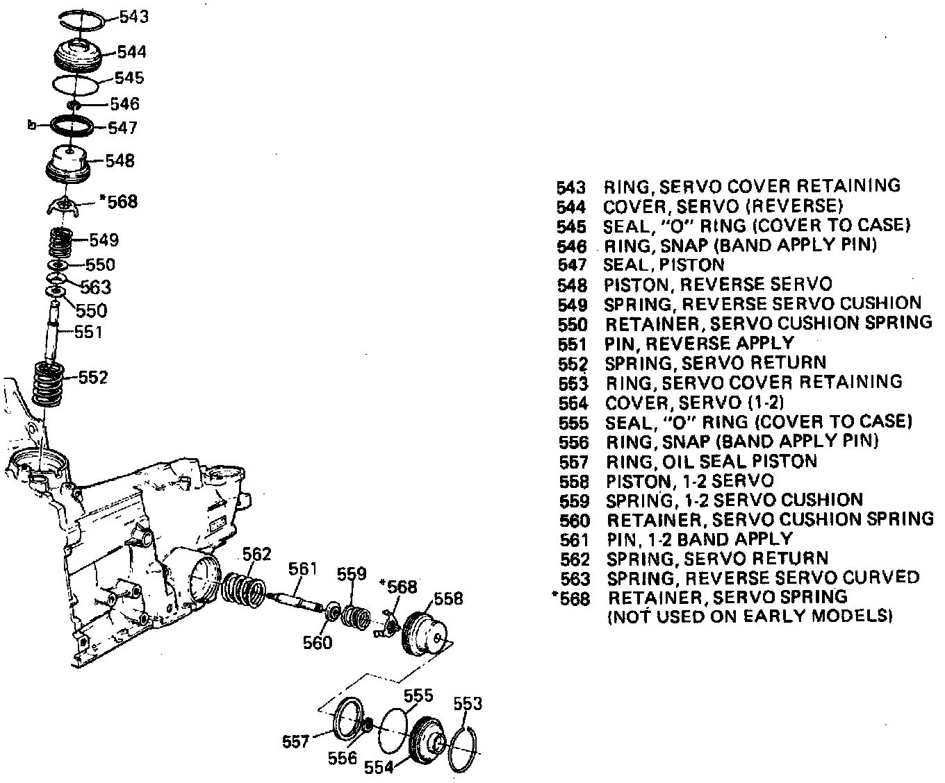 205. Install servo return spring into servo bore, then insert servos into case.