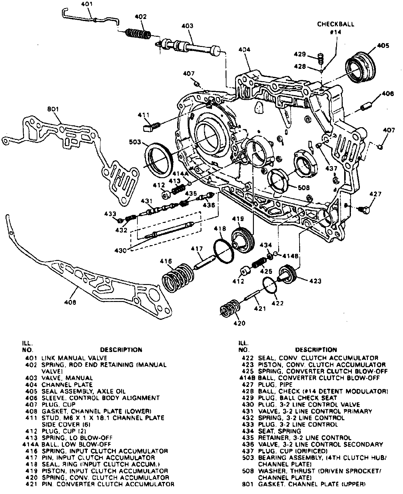 147. Install manual valve and link, and secure with spring or clip, then position oil weir between channel plate and case.