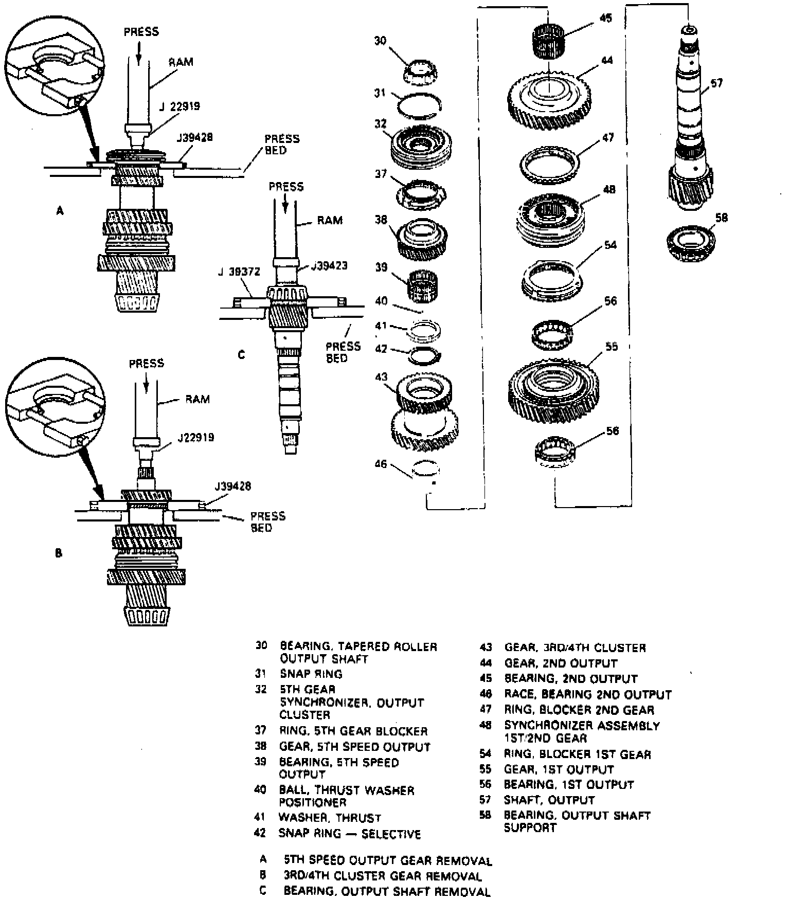 1. Remove fifth gear (38) and bearing (39) using press, split plate tool No. J-39428 and press adapter tool No. J-22919, or equivalents.
