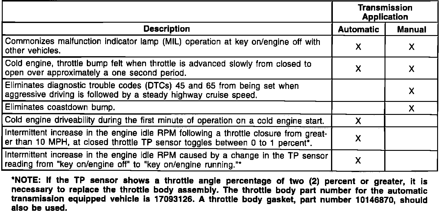 These driveability concerns can be corrected with a new "Flash" EE PROM program and/or replacement of the throttle body. See illustration.