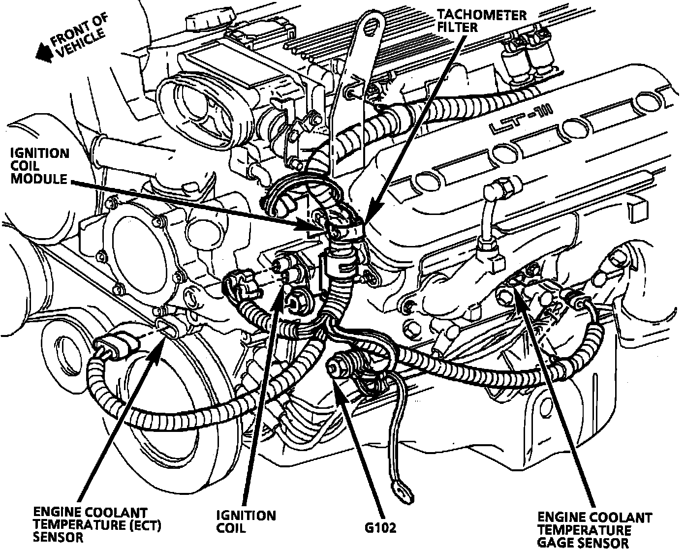 The engine coolant temperature sensor is located in the left front of engine.