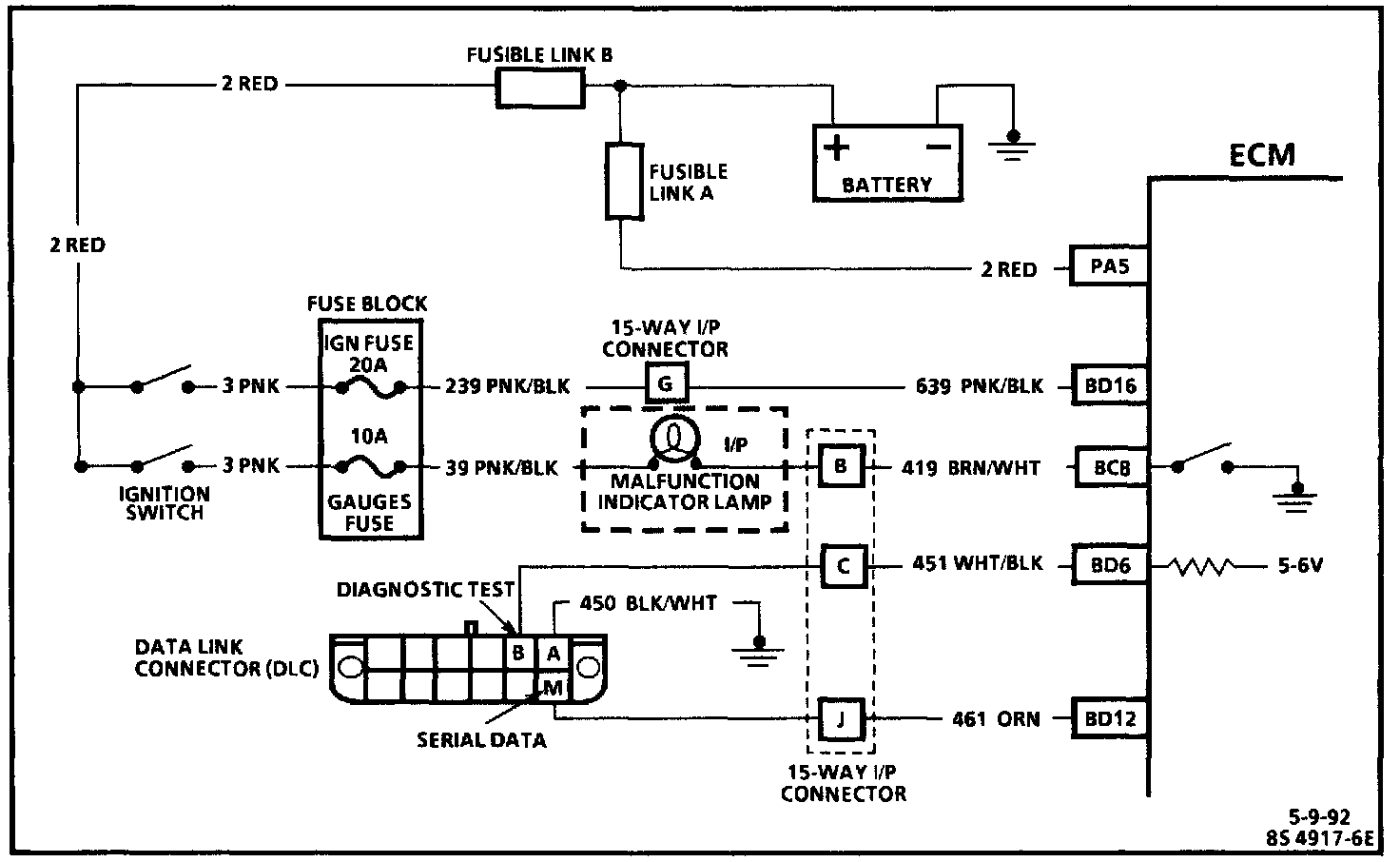 There should always be a steady MIL (Service Engine Soon) when the ignition is 'ON" and engine stopped. Battery voltage is supplied through the ignition switch directly to the lamp. The Engine Control Module (ECM) controls the lamp and turns it "ON" by providing a ground path through CKT 419 to the ECM.