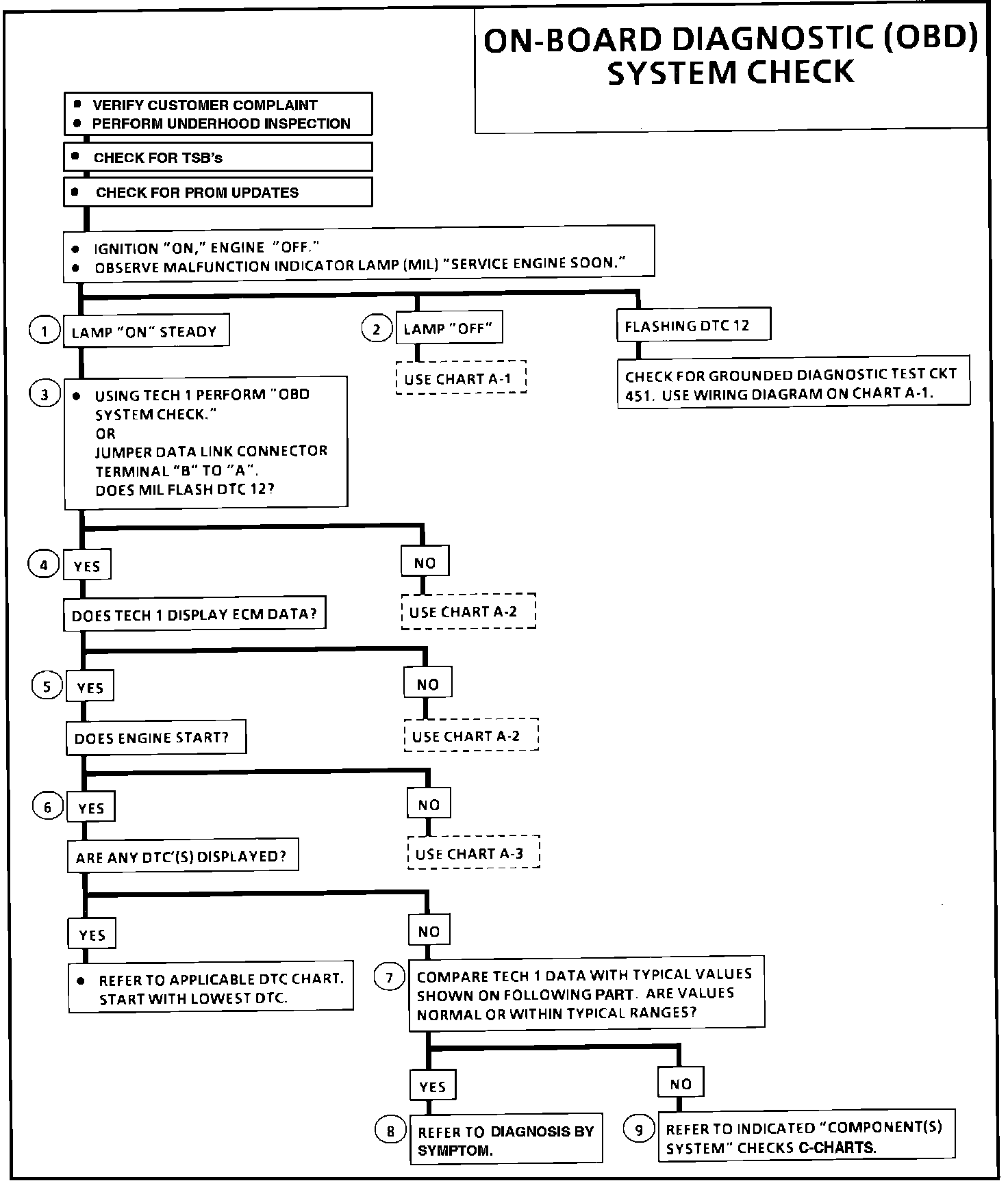 The diagnostic circuit check is an organized approach to identifying a problem created by an electronic engine control system malfunction. It must be the starting point for any driveability complaint diagnosis, because it directs the service technician to the next logical step in diagnosing the complaint. Understanding the chart and using it correctly will reduce diagnostic time and prevent the unnecessary replacement of good parts.
