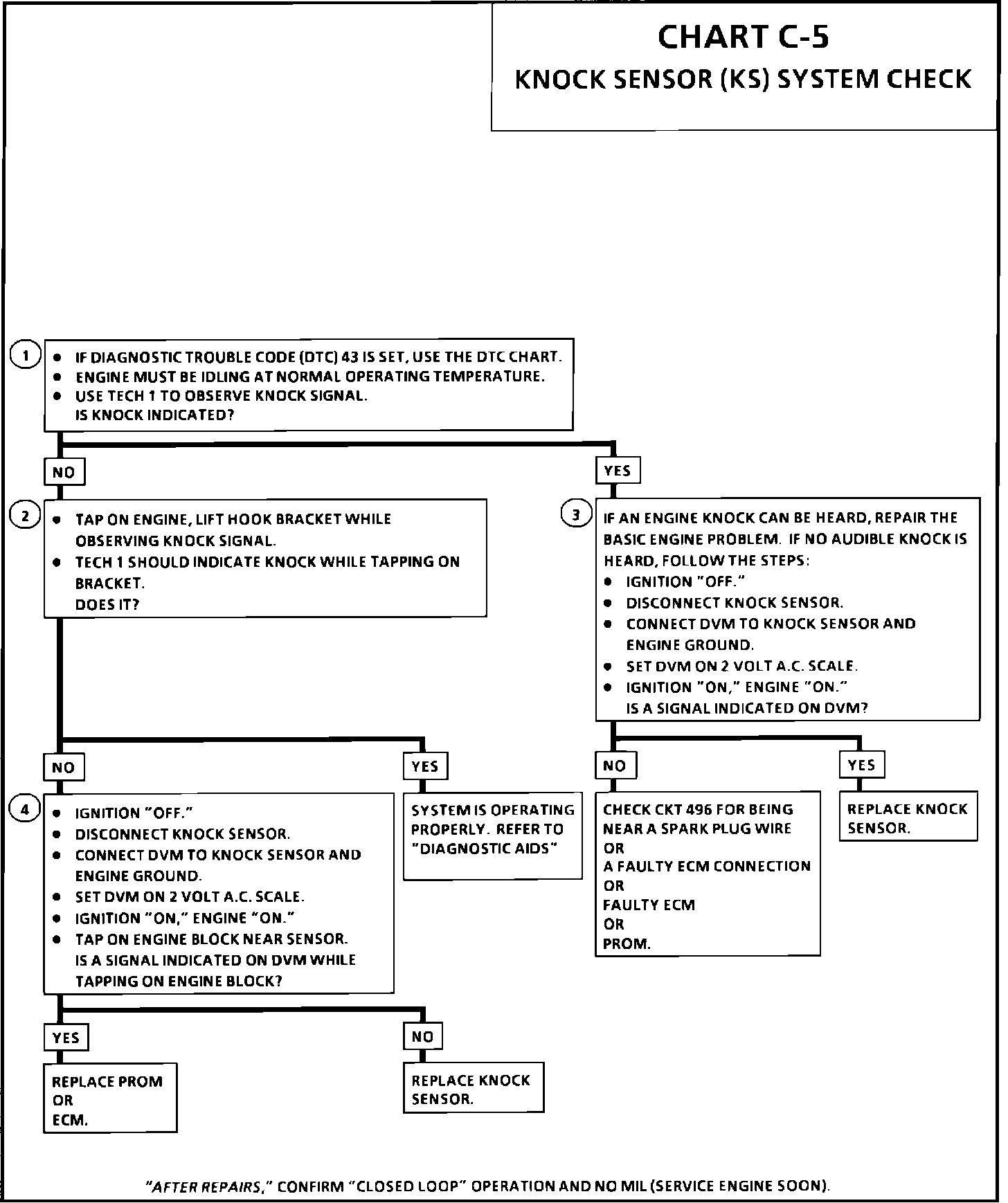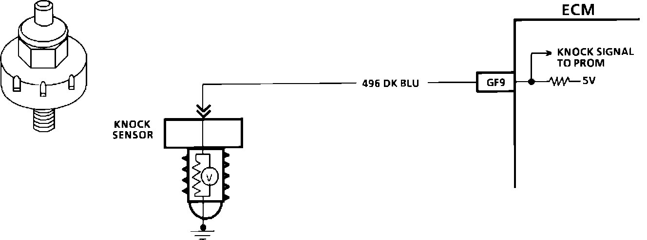 The knock Sensor (KS) is used to detect engine detonation and the ECM will retard the ignition control timing based on the signal being received. The circuitry, within the knock sensor, causes the ECMs 5 volts to he pulled down so that under a no knock condition, CKT 496 would measure about 2.5 volts. The knock sensor produces an AC signal, which rides on the 2.5 volts DC voltage. The amplitude and frequency are dependent upon the knock level.