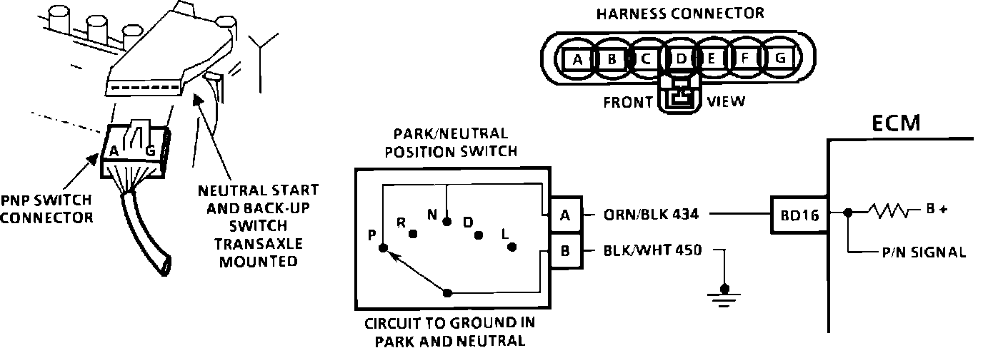 The ECM supplies ignition voltage through a pull-up resistor to CKT 434 and senses a closed switch when the voltage on CKT 434 drops to less than one volt. The ECM uses the PNP signal as one of the inputs to control: