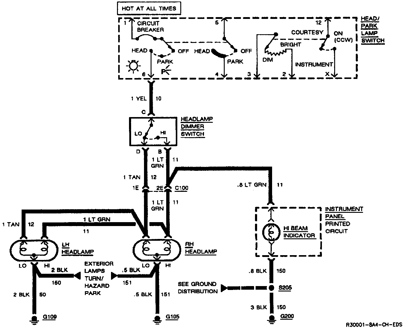 Furthermore, since you saw that the High Beam Indicator came on when the Headlamp Dimmer Switch was moved to HI, you know that the HI contacts of the dimmer switch and the LT GRN wire between the dimmer switch and C100 are good.