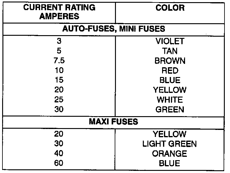 Auto-fuses, Mini Fuses and Maxi Fuses are color coded. The standardized color identification and ratings are shown in the table.