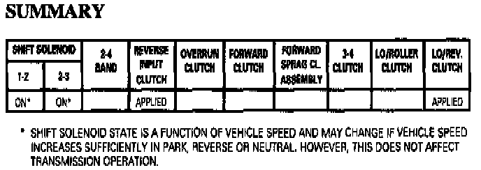 Lo and Reverse Clutch: As in Park, PR fluid pressure acts on the outer area of the lo and reverse clutch piston to apply the lo and reverse clutch. Also, lo/reverse fluid from the lo overrun valve acts on the inner area of the piston to increase the holding capacity of the clutch (see Note Below).