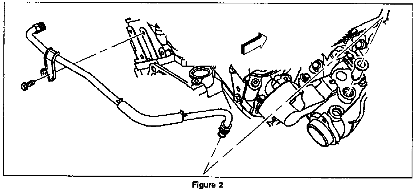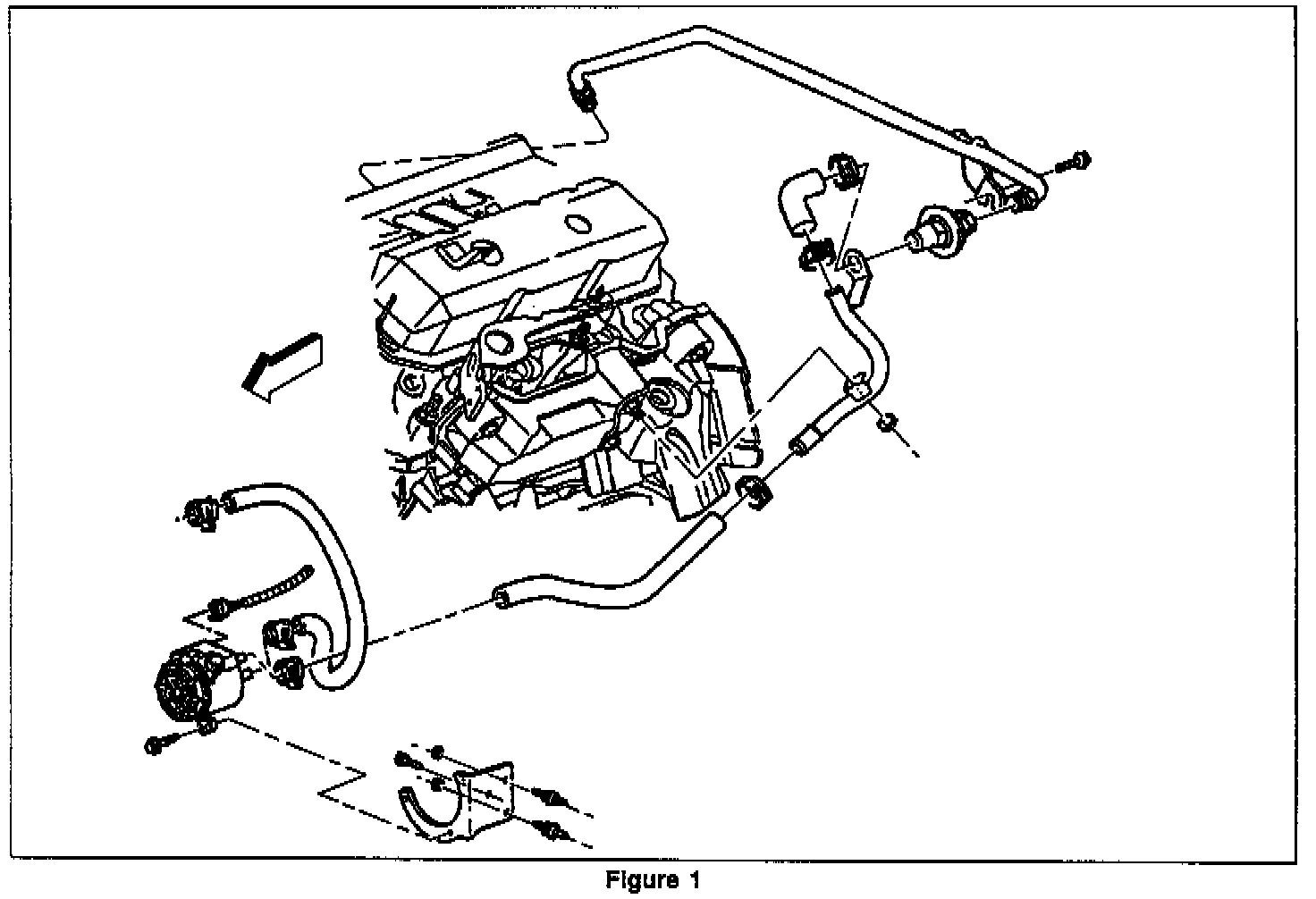 To address this temporary lean running condition during warm up, a new flash calibration has been developed. This new calibration richens the open-loop air/fuel ratio at 20° C to 32° C range (68° F - 89° F). To ensure compliance with Federally mandated emission levels, an A.I.R.. (air injection reaction) kit has been developed along with a new three way catalytic converter. If, after exhausting normal diagnostic procedures, it is determined that the A.I.R. kit along with the calibration is necessary to correct the vehicle, the following procedure should be used to install the A.I.R.. kit. Figures 1 and 2 are a pictorial of the parts installed in the kit.
