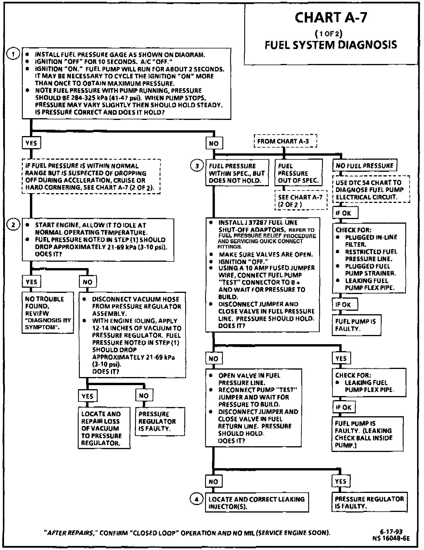 2. When the engine is idling, manifold pressure is low (high vacuum) and is applied to the pressure regulator diaphragm. Vacuum will offset spring pressure and result in a lower fuel pressure. Fuel pressure at idle will vary somewhat depending on barometric pressure but, should be less than pressure noted in Step (1).