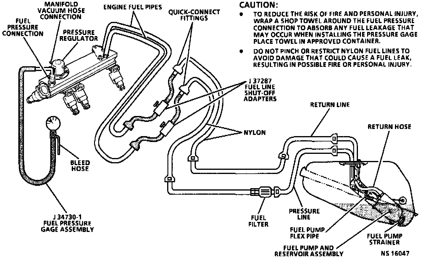 Inside the fuel tank an electric fuel pump (within an integral reservoir) supplies fuel through an in-line filter to the fuel rail assembly. The pump is designed to provide fuel at a pressure above the regulated pressure needed by the injector. A pressure regulator attached to the fuel rail, keeps fuel available to the injectors at a regulated pressure. Unused fuel is returned to the fuel tank by a separate line. The fuel pump "test" connector is located in the engine compartment near the passenger side shock tower