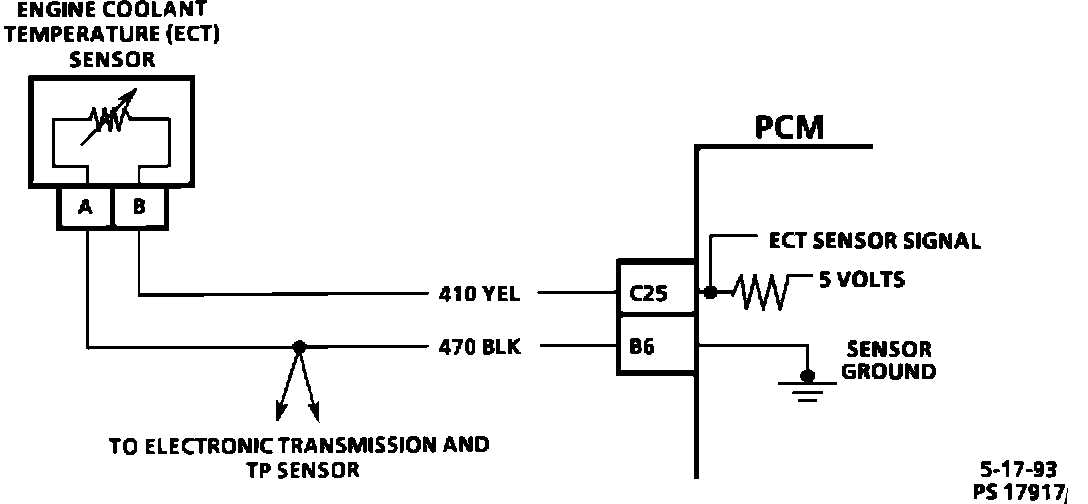 The computer sends a 5.0 volt signal to the coolant temperature sensor through a resistor in the PCM and measures the voltage. The voltage will be high or low depending on coolant temperature. By varying the voltage, the computer will sense engine coolant temperature.