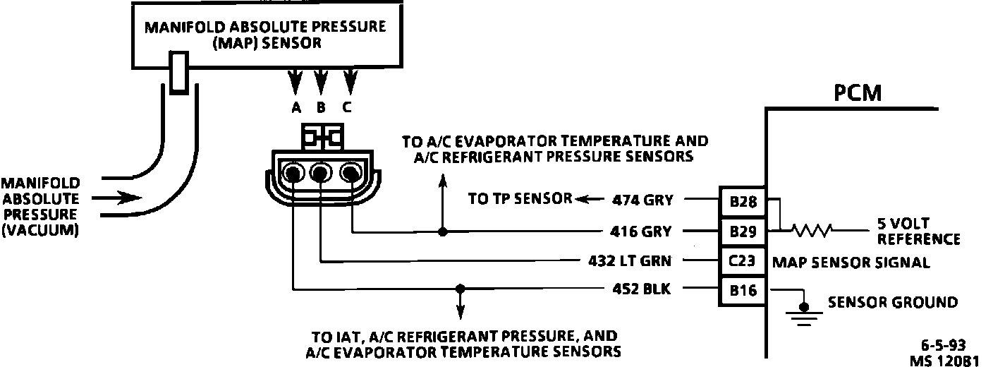 The Manifold Absolute Pressure (MAP) sensor measures the changes in the intake manifold pressure which result from engine load (intake manifold vacuum) and RPM changes. and converts these into a voltage output. The Powertrain Control Module (PCM) sends a 5 volt reference voltage to the MAP sensor. As the manifold pressure changes, the output voltage of the sensor also changes. By monitoring the sensor output voltage, the PCM knows the manifold pressure. A lower pressure (low voltage) output voltage will be about 1 - 2 volts at idle. While a higher pressure (high voltage) output voltage will be about 4 - 4.8 at Wide Open Throttle (WOT). The MAP sensor is also used, under certain conditions, to measure barometric pressure, allowing the PCM to make adjustments for different altitudes. The PCM uses the MAP sensor to control fuel delivery and ignition timing.