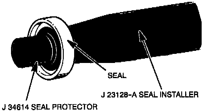 4. Install the new seal retainer ring with its flat side against the seal, using snap-ring pliers J 5403. Use the sleeve from O-ring installer J 33011 to press In on the seal retainer ring so that it snaps into its groove.